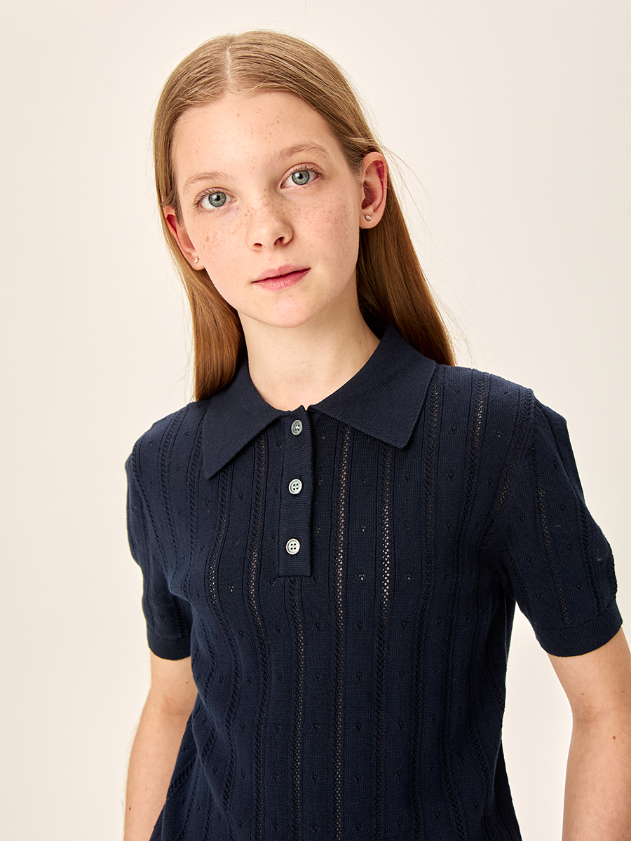 вязаный джемпер с воротником поло для девочки сочетает в себе стильный дизайн и максимальный комфорт для ребенка. Изготовлен из мягкого хлопка, что обеспечивает комфорт в течение всего дня.