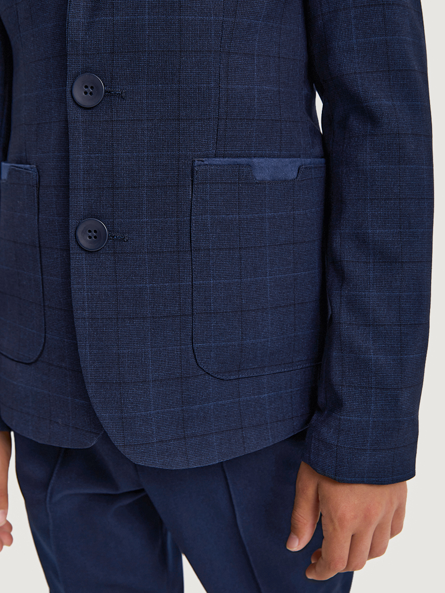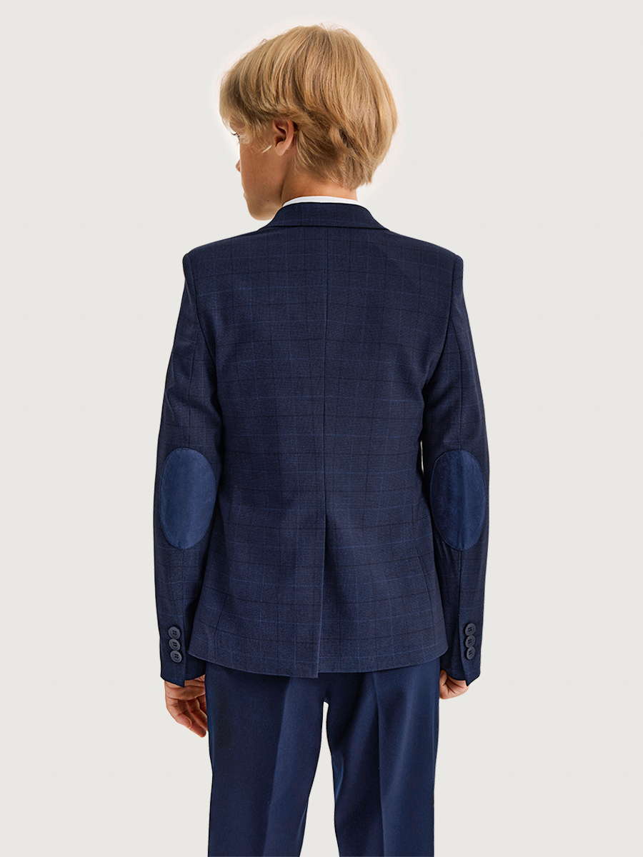 Пиджак с налокотниками и деталями из отделочной ткани – идеальное решение для мальчика, который ценит комфорт и стиль. Прочная, качественная костюмная ткань с содержанием вискозы не мнется и обеспечивает удобство при носке. Пиджак имеет треугольный вырез и отложной воротник с лацканами, которые придают ему строгий и элегантный вид. Полуприлегающий силуэт с вытачками обеспечивает идеальную посадку по фигуре ребенка.