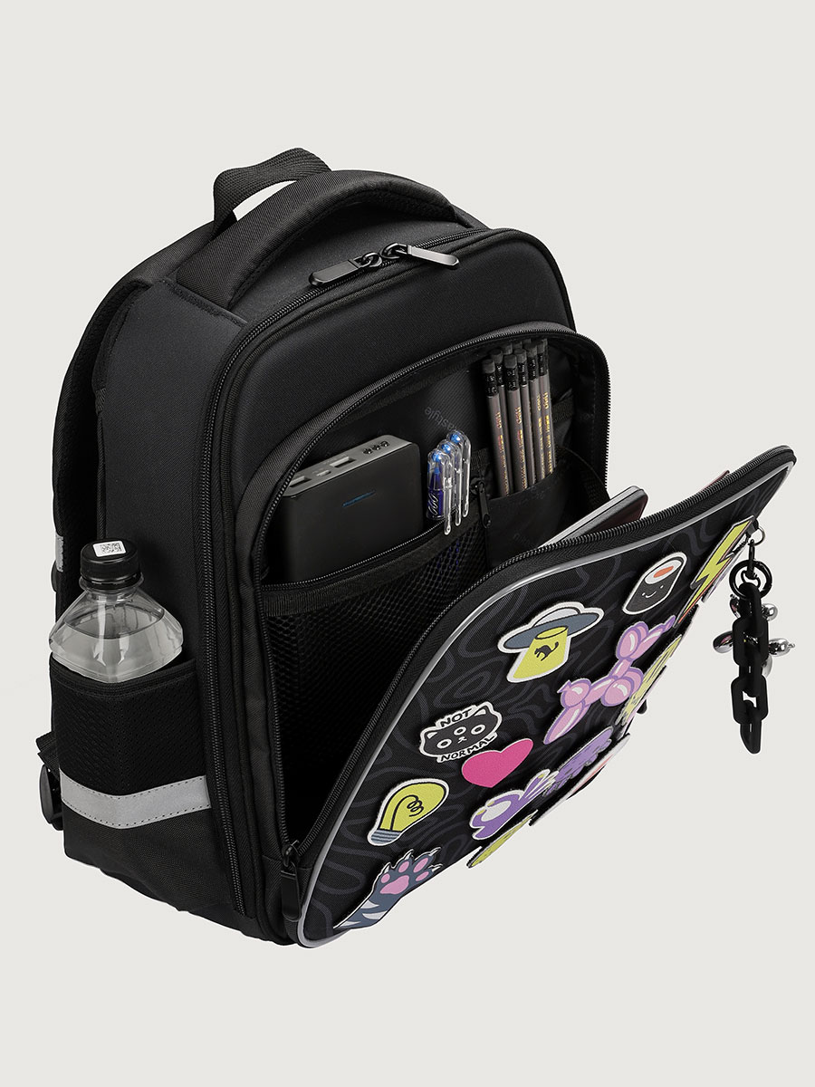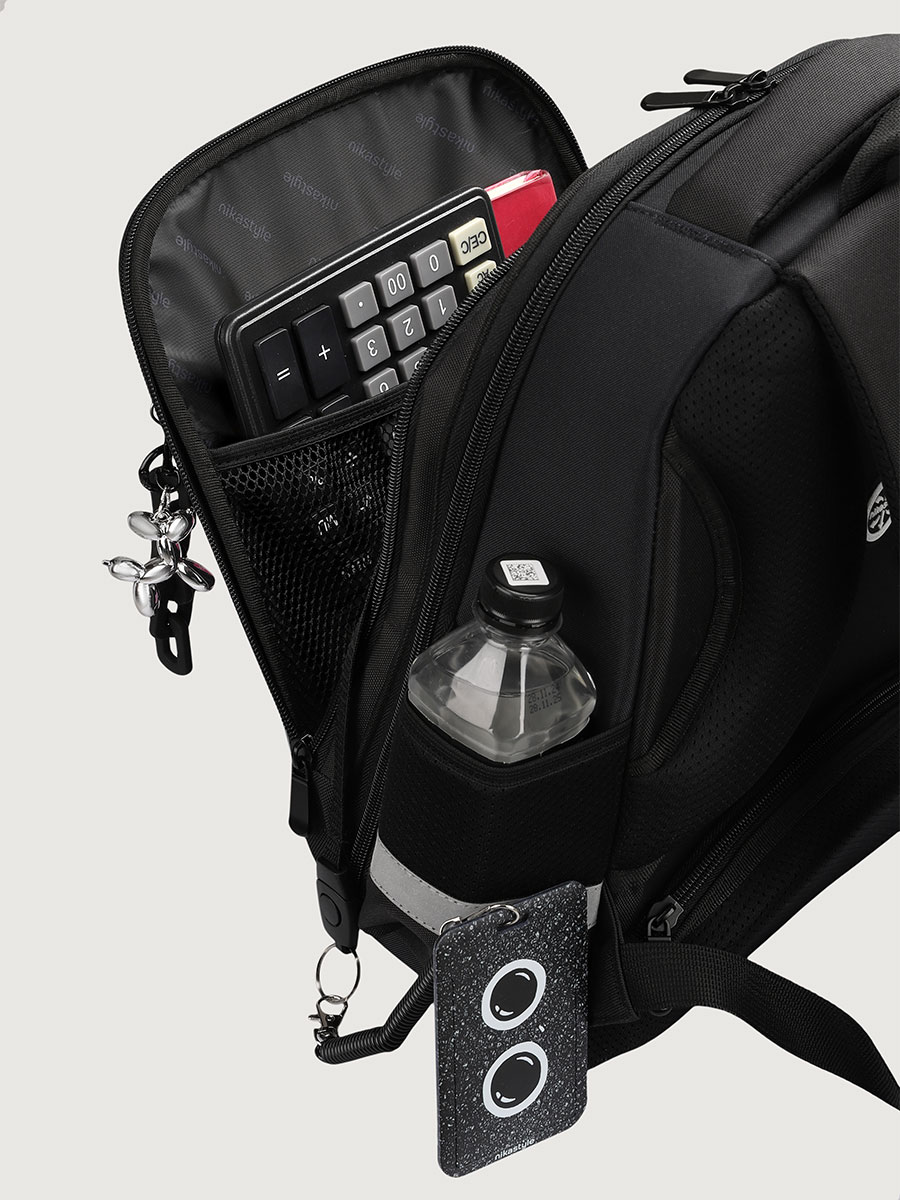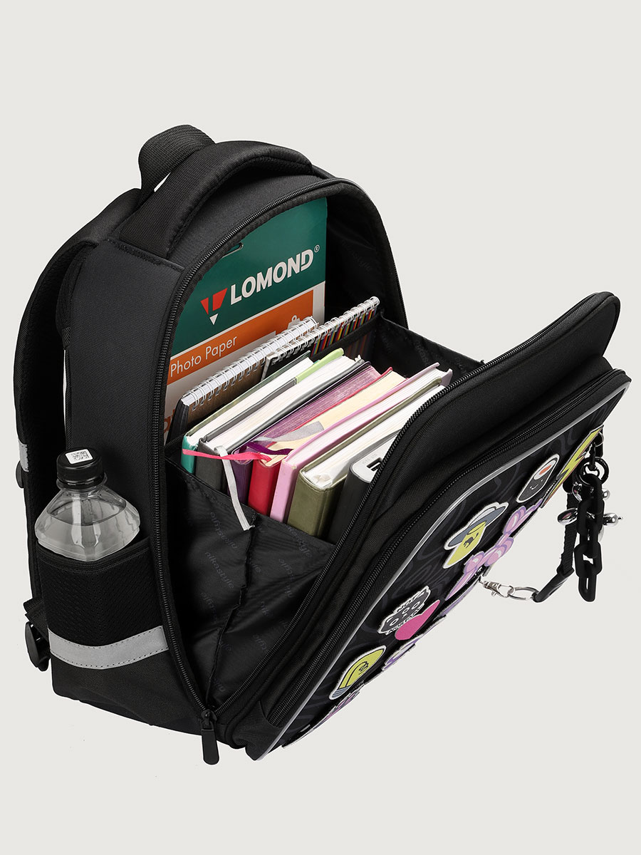 Анатомическая, продуманная, дышащая спинка позволяет равномерно распределить нагрузку на спину, уменьшая давление на позвоночник. Мягкие эластичные накладки из дышащего сетчатого материала на спинке и лямках обеспечивают правильную циркуляцию воздуха. S-образные обтекаемые лямки, регулируемые под рост петлями на концах, разработаны с учетом строения тела, в результате чего нагрузка на плечи распределяется равномерно . Ремень с застежкой удерживает лямки от спадания, снимает нагрузку с поясничного отдела. Эргономичная, мягкая ручка удобна для переноса в руке, петля-ручка для подвешивания ранца в раздевалке или на парте. Плотное дно на ножках делает рюкзак устойчивым и не промокает. Световозвращающие элементы со всех сторон ранца и кант на передней части обеспечивают безопасность ребенка на дороге в темное время суток. Подходит по размеру для ручной клади