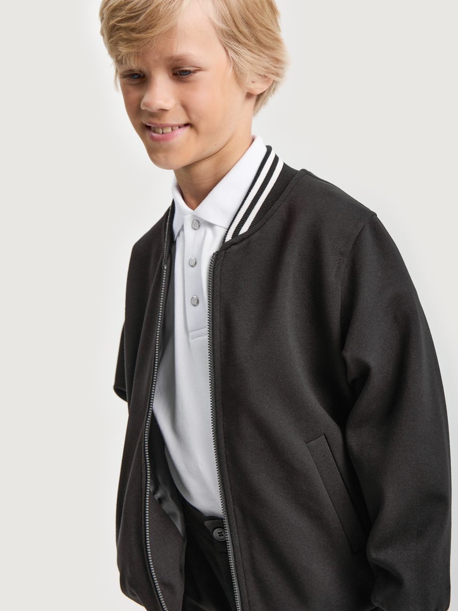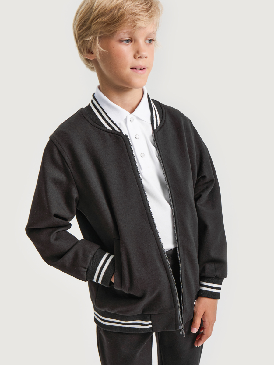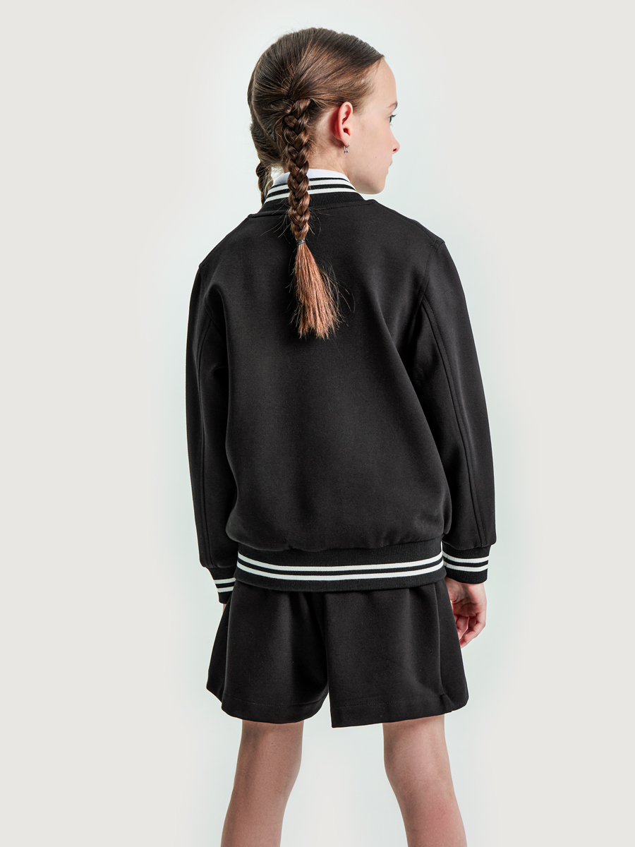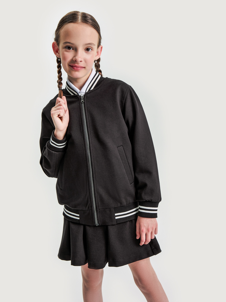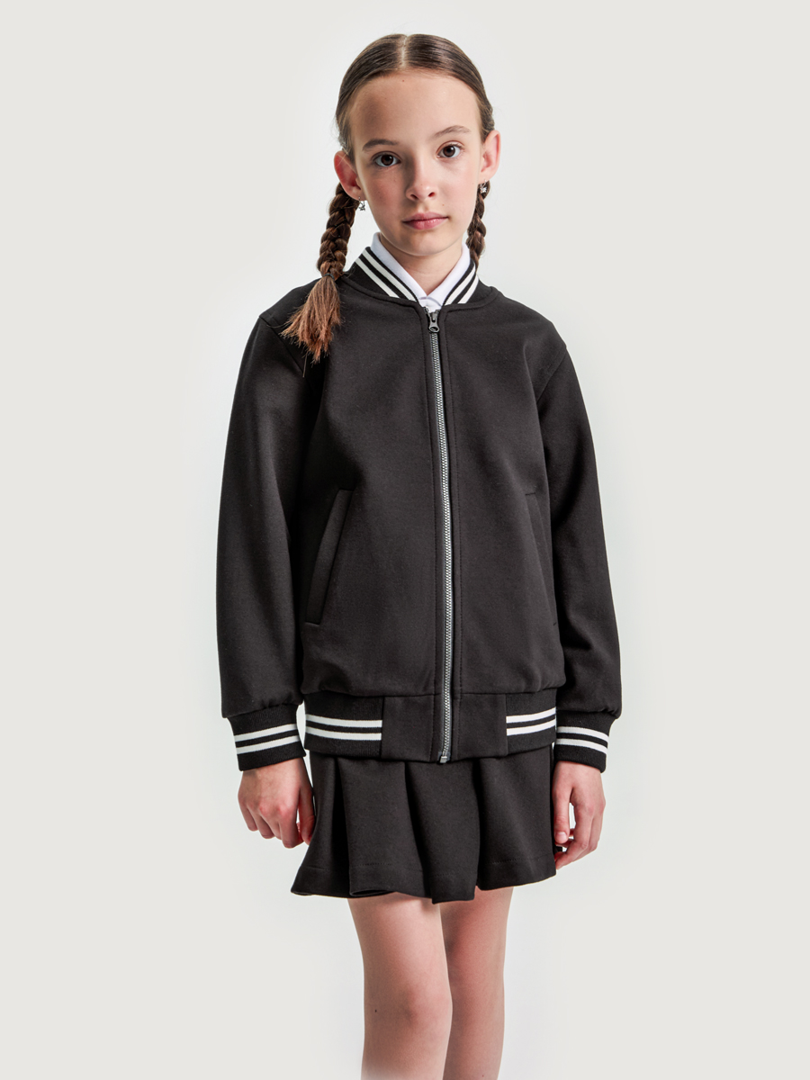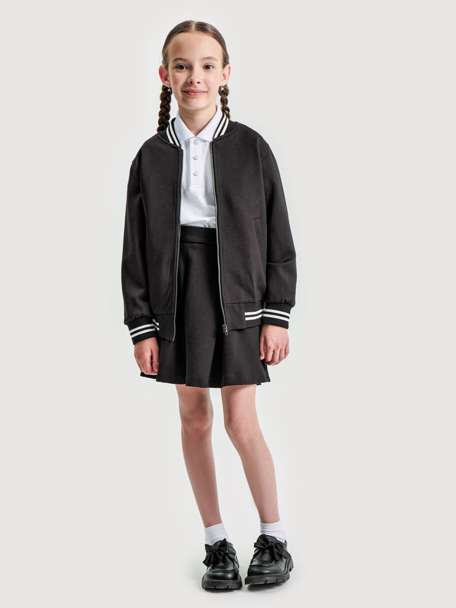 Бомбер можно носить самостоятельно или собрать костюм из нашей школьной коллекции, дополнив образ брюками или юбкой-шортами. Такой комплект будет идеальным выбором для школьной формы.