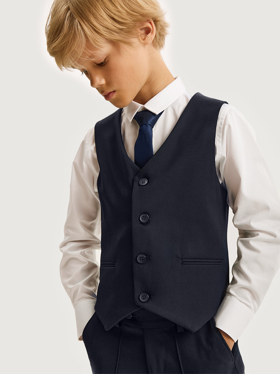 Модель на подкладке, полуприлегающего силуэта. Вырез горловины V-образный. Подходит для повседневной носки, а также на школьные мероприятия и выступления — это универсальная вещь.