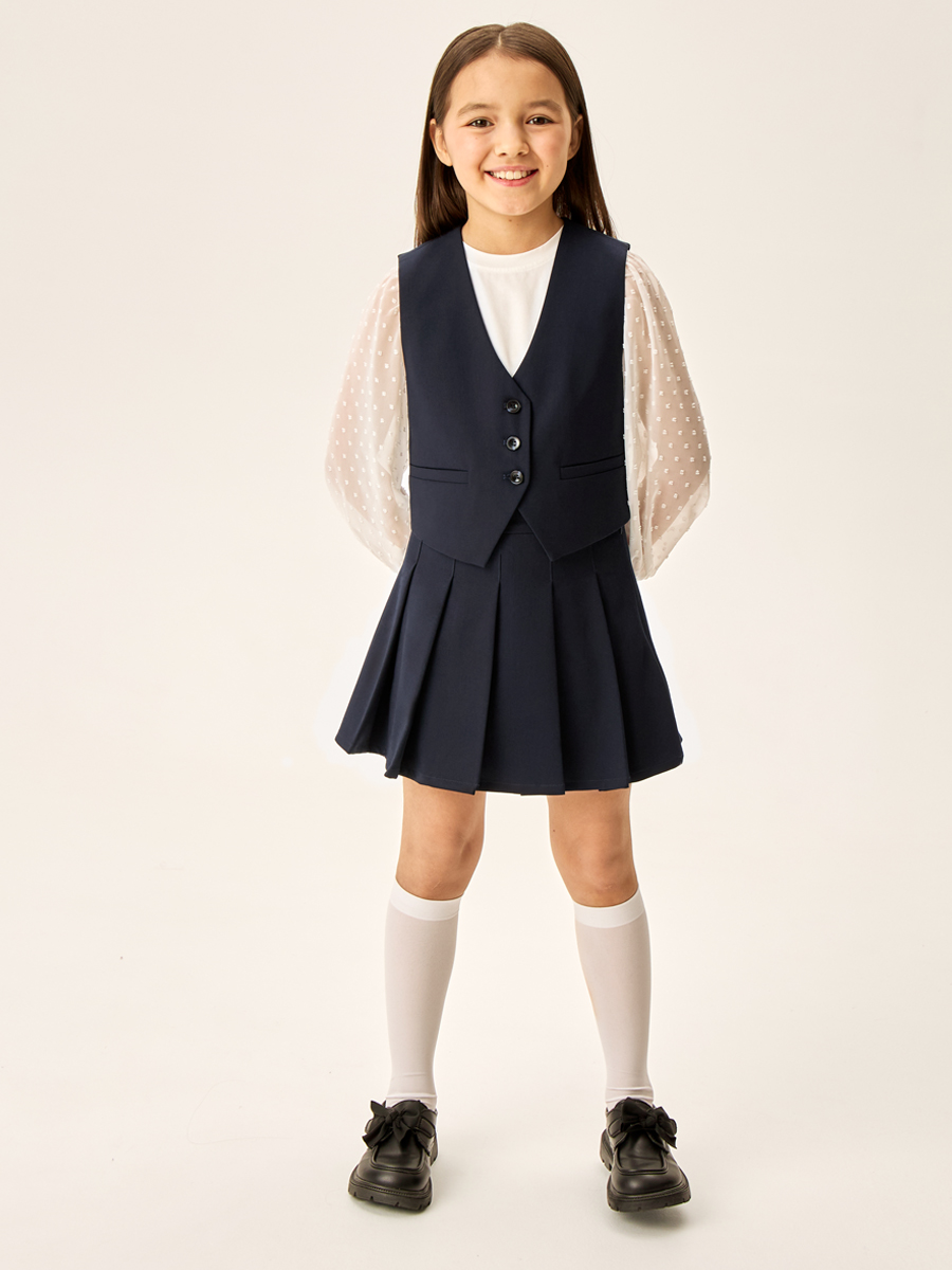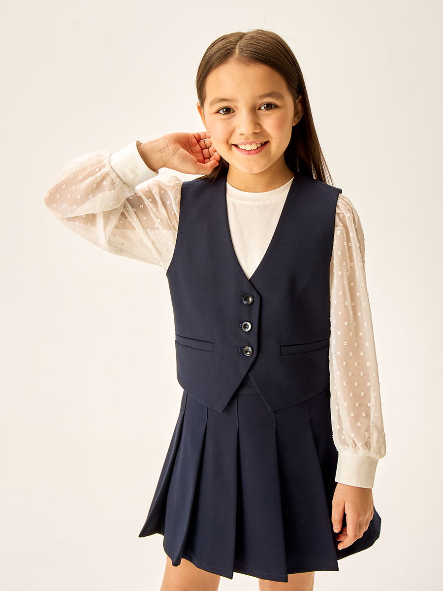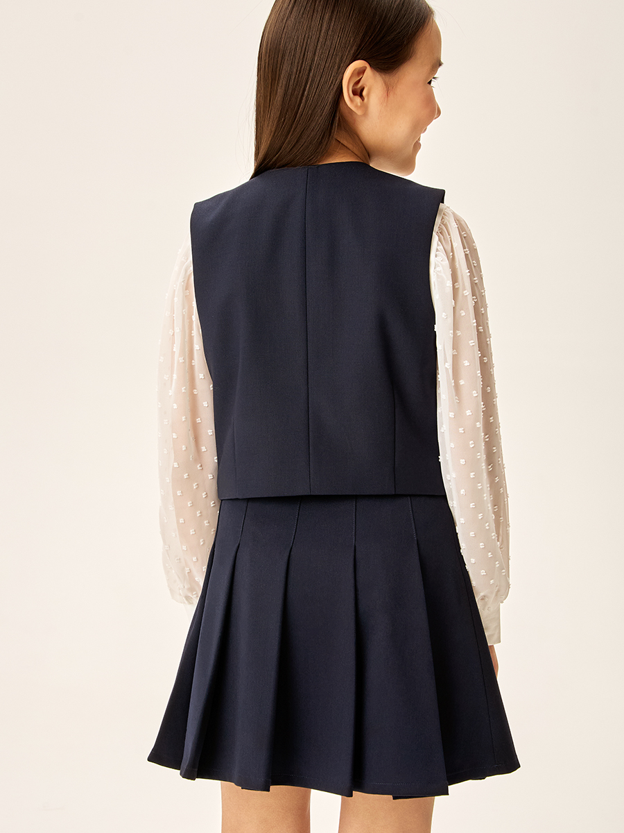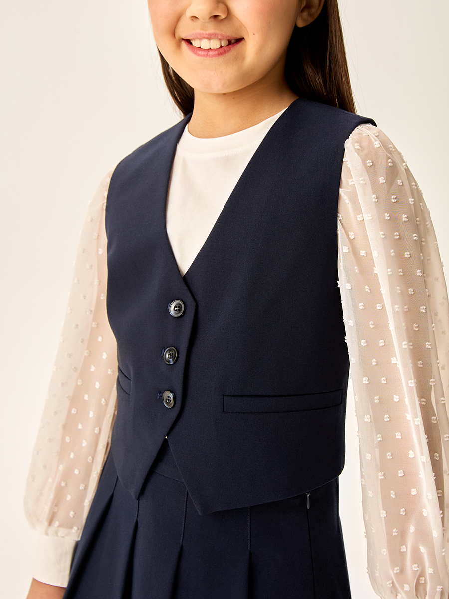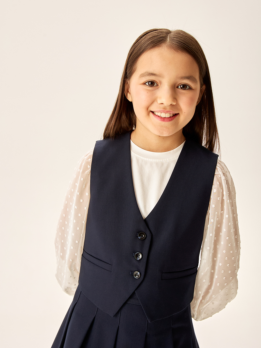 Жилет для девочки из прочной, качественной костюмной ткани с содержанием вискозы не мнется и обеспечивает удобство при носке.