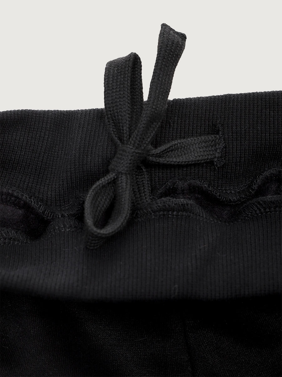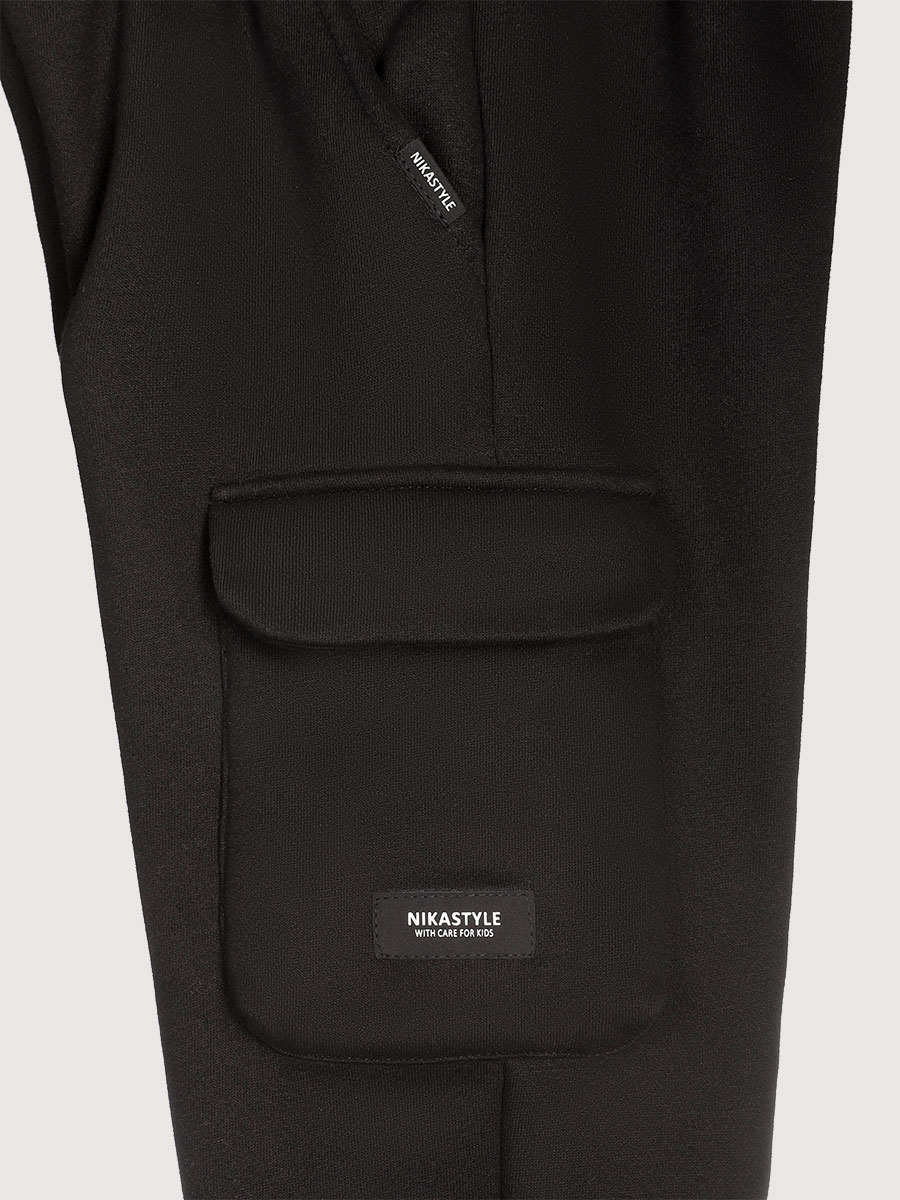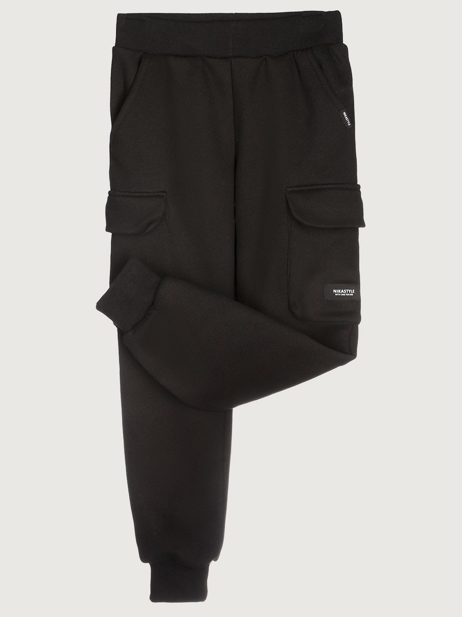 Брюки свободного силуэта, зауженные к низу, с боковыми и накладными карманами, с трикотажными манжетами. Пояс с резинкой и со шнуром для дополнительной регулировки объема по талии.
