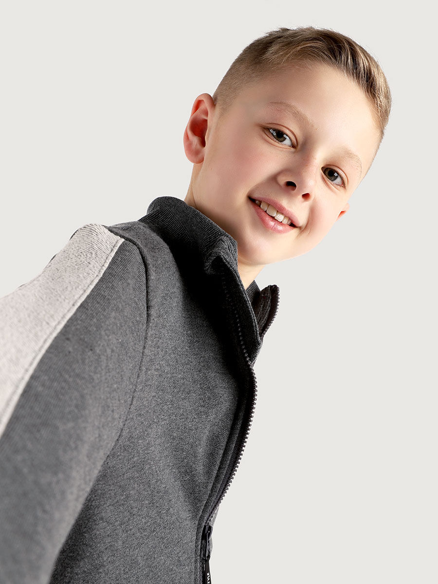 Спортивный костюм ФИЗ-РА из петельного, плотного хлопкового трикотажа. Состоит из двух предметов — толстовки и брюк. Толстовка свободного силуэта, с воротником-стойкой, на молнии, с карманами. Манжеты и пояс из трикотажного полотна «кашкорсе».