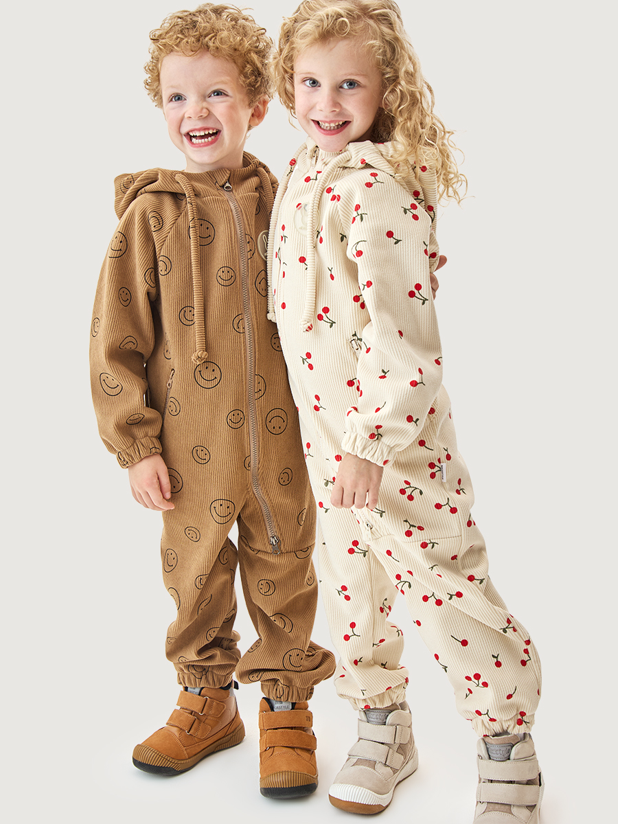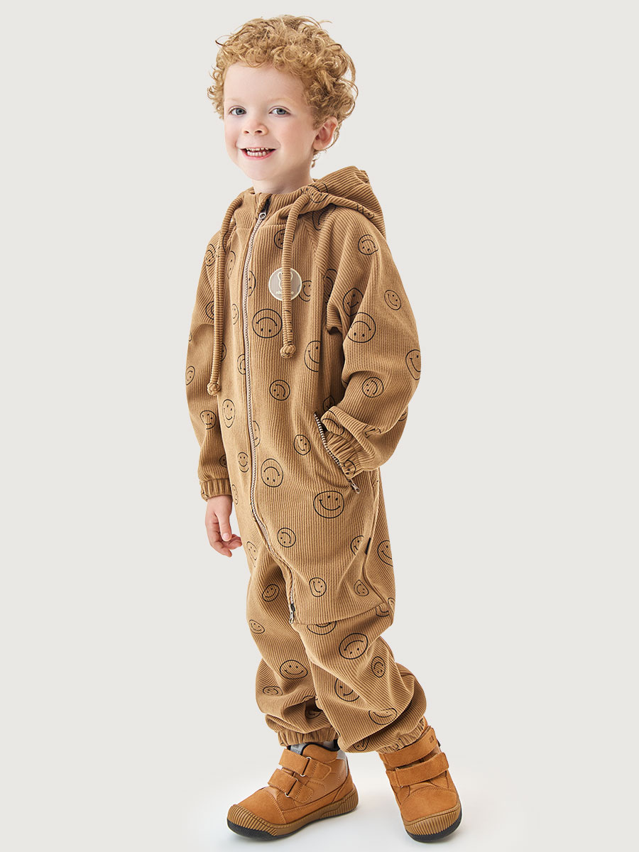 Комбинезон СМАЙЛ из вельвета, дублированного велюром. Вельвет - это мягкая, бархатистая ткань в рубчик. Благодаря тому, что с изнаночной стороны вельвет продублирован мягким велюром, ребенку будет комфортно и тепло в прохладные дни.