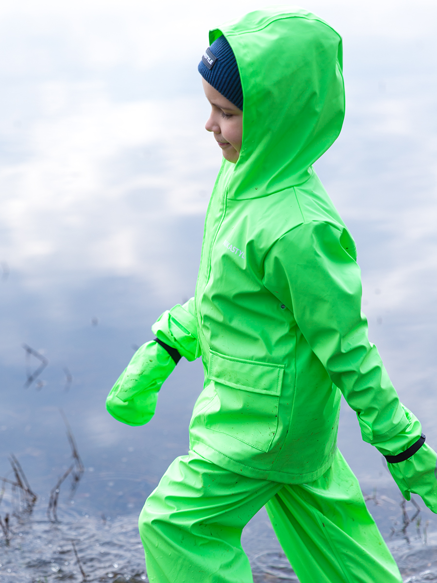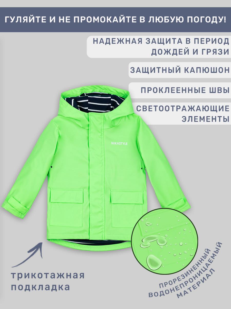 Непромокаемая ветровка NO RAIN с проклеенными водонепроницаемыми швами для защиты ребенка от влаги. На трикотажной подкладке. Прорезиненный материал ткани на хлопковой основе обладает эластичностью, упругостью и прочностью, его смесь с хлопком придает большую мягкость ткани. Водонепроницаемый, легкий, прочный материал, обеспечивает сухость, чистоту и комфорт для ребенка. Незаменимая вещь для практичных родителей и их непоседливых малышей. Центральная застежка на молнию и планку на кнопках. Ветровка в двумя накладными карманами на кнопках. Наличие светоотражающих элементов для безопасности ребенка в темное время суток. Комфортная температура эксплуатации от +10 до +20 С.