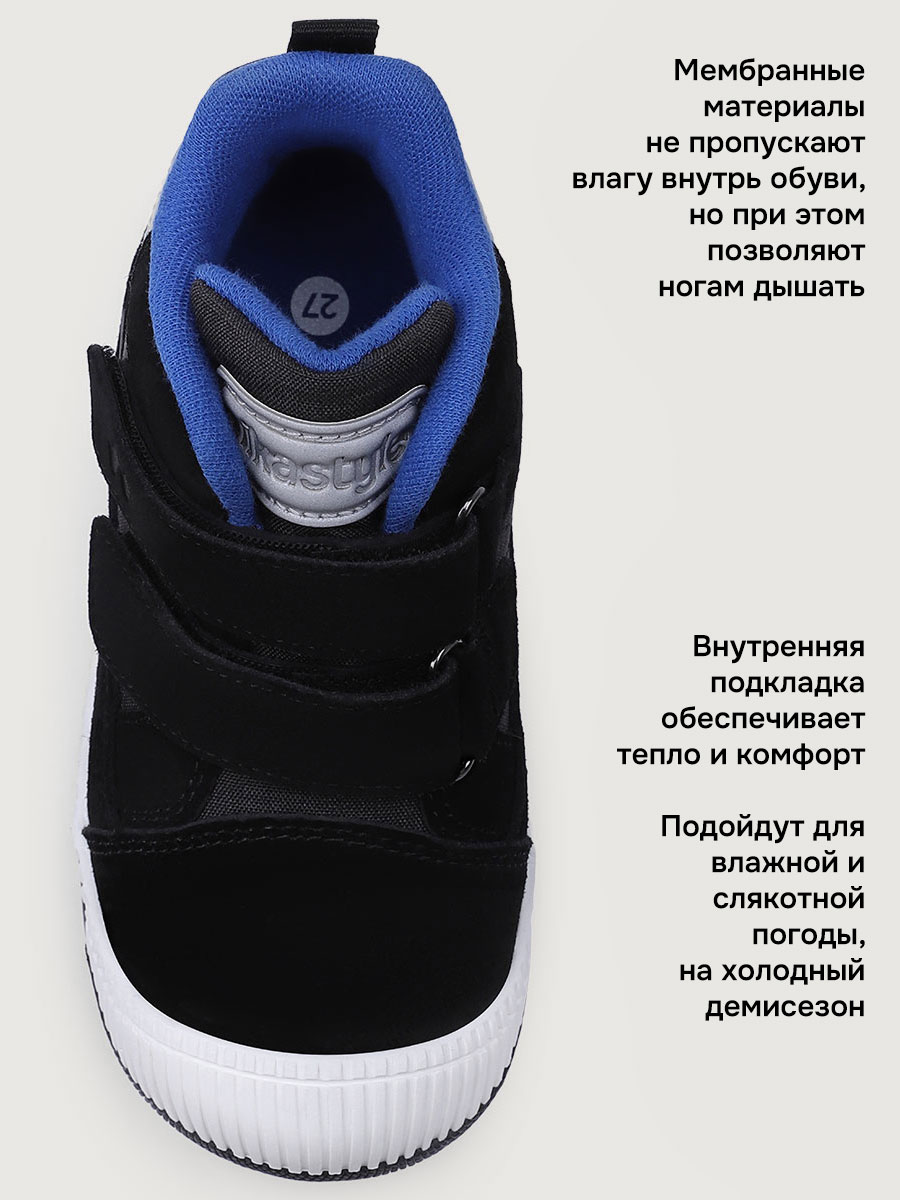 Технология WATERPROOF с использованием мембранных материалов, которые не пропускают влагу внутрь обуви, но позволяют ногам дышать и подойдут для влажной и слякотной погоды. Внутренняя подкладка из хлопка обеспечивает тепло и комфорт, что особенно актуально в холодное время года. Анатомическая форма стельки способствует правильному формированию свода стопы, равномерно распределяет нагрузку, уменьшает усталость, обеспечивает правильное развитие стоп. Эти ботинки ребенок легко обует самостоятельно, так как липучка обеспечивают легкое одевание и позволяет точно настроить полноту. Подошва с протектором выполнена из термопластичной резины (TPR), обладает высокой износостойкостью и хорошей амортизацией, уменьшая нагрузку на ноги. Наличие светоотражающих элементов для безопасности ребенка в темное время суток.