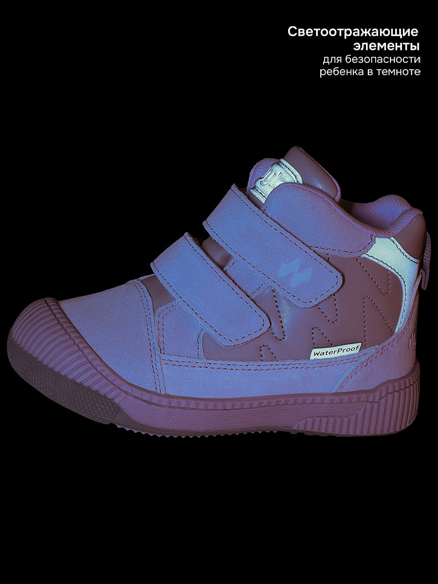 Технология WATERPROOF с использованием мембранных материалов, которые не пропускают влагу внутрь обуви, но позволяют ногам дышать и подойдут для влажной и слякотной погоды. Внутренняя подкладка из хлопка обеспечивает тепло и комфорт, что особенно актуально в холодное время года. Анатомическая форма стельки способствует правильному формированию свода стопы, равномерно распределяет нагрузку, уменьшает усталость, обеспечивает правильное развитие стоп. Эти ботинки ребенок легко обует самостоятельно, так как липучка обеспечивают легкое одевание и позволяет точно настроить полноту. Подошва с протектором выполнена из термопластичной резины (TPR), обладает высокой износостойкостью и хорошей амортизацией, уменьшая нагрузку на ноги. Наличие светоотражающих элементов для безопасности ребенка в темное время суток.