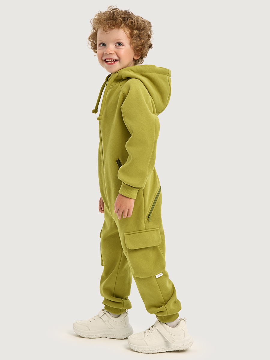 Комбинезон С КЛАПАНОМ из плотного хлопкового трикотажа с мягким стриженным начесом внутри. Модель с капюшоном, карманами на молнии. Удлиненные манжеты на рукавах и брюках из трикотажного полотна «кашкорсе», растут вместе с ребенком, надежно облегают запястье ребенка. Комбинезон с застежкой на молнию.