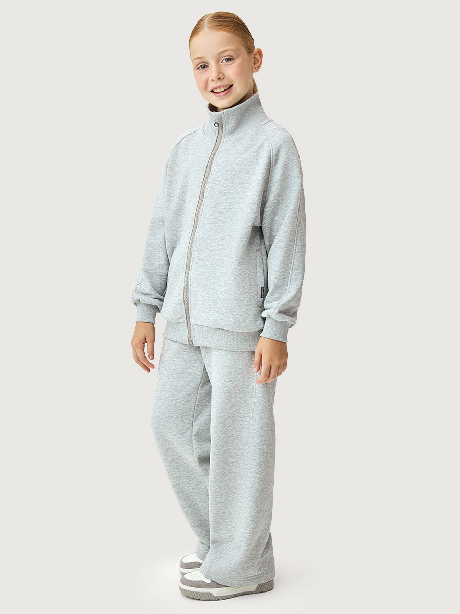 Спортивный костюм ФИЗ-РА из петельного, плотного хлопкового трикотажа. Состоит из двух предметов — толстовки и брюк. Толстовка свободного силуэта, с воротником-стойкой, на молнии, с карманами в рельефах. Манжеты, пояс и воротник из трикотажного полотна «кашкорсе».