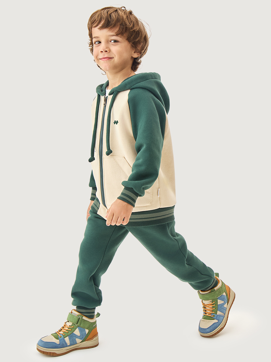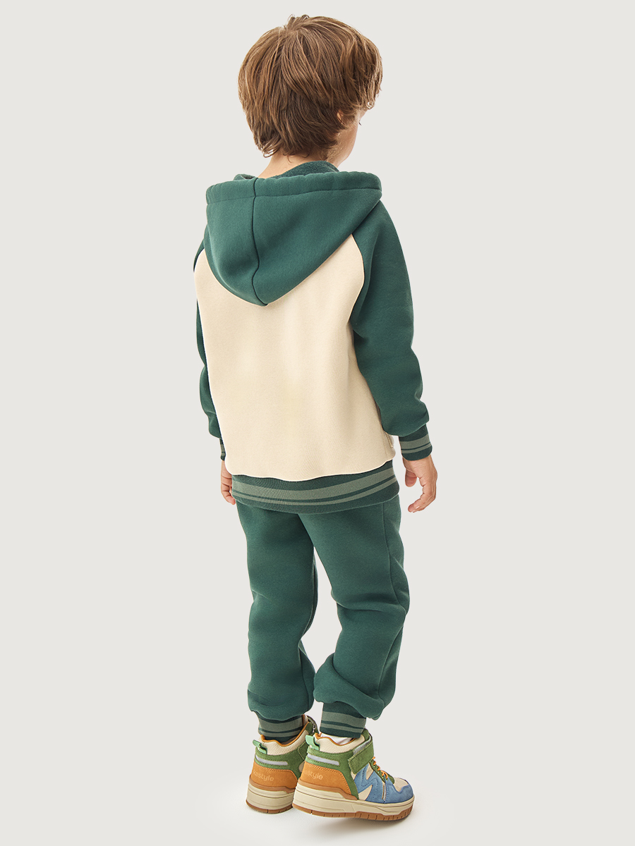 Костюм КОЛЛЕДЖ из плотного хлопкового трикотажа с мягким стриженным начесом внутри. Состоит из двух предметов — толстовки и брюк. Толстовка свободного силуэта, на молнии, с капюшоном, с карманами «кенгуру». Манжеты и пояс из трикотажного полотна «кашкорсе».