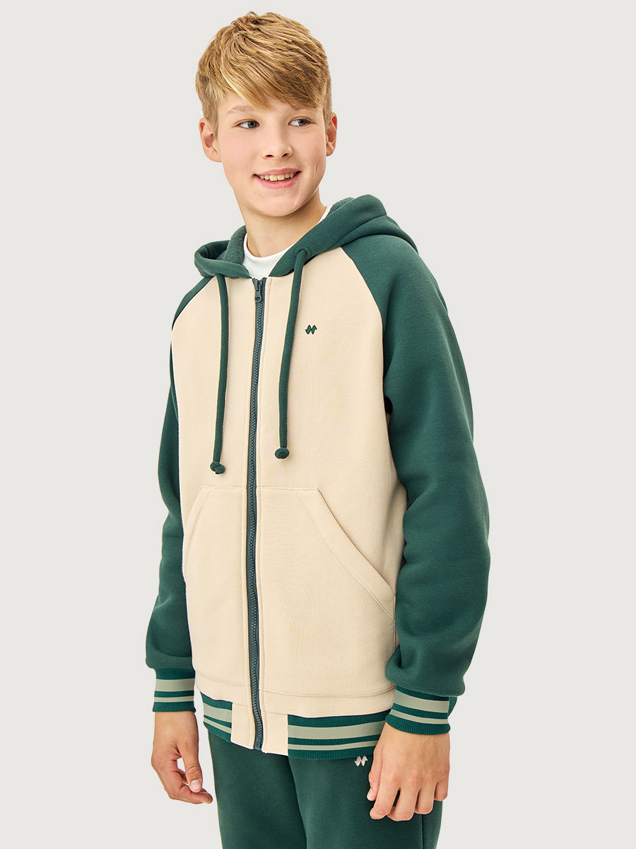 Костюм КОЛЛЕДЖ из плотного хлопкового трикотажа с мягким стриженным начесом внутри. Состоит из двух предметов — толстовки и брюк. Толстовка свободного силуэта, на молнии, с капюшоном, с карманами «кенгуру». Манжеты и пояс из трикотажного полотна «кашкорсе».
