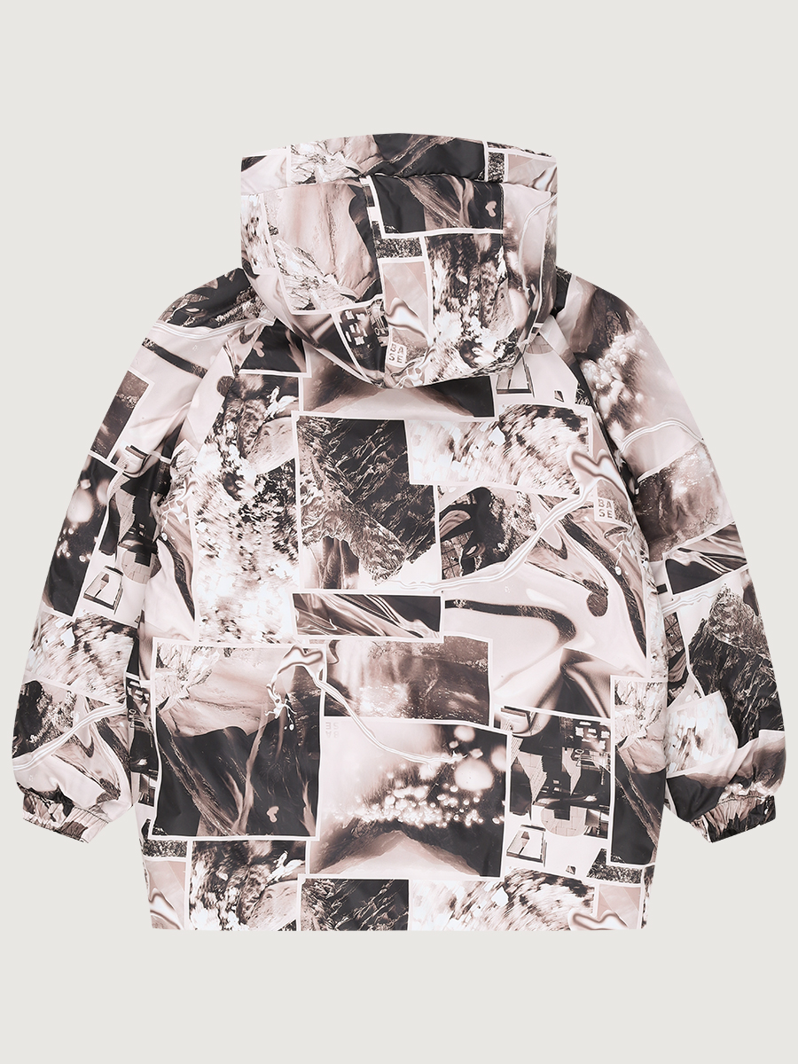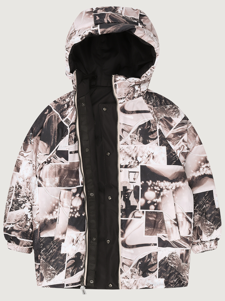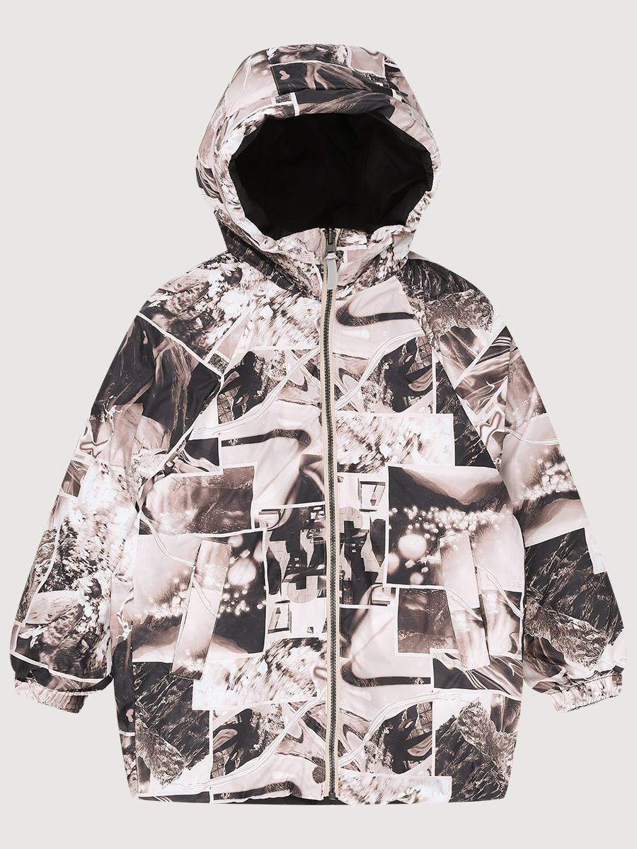Одна сторона куртки из мембранной ткани 5000/5000 простегана с утеплителем, вторая сторона из плащевой ткани с принтом.