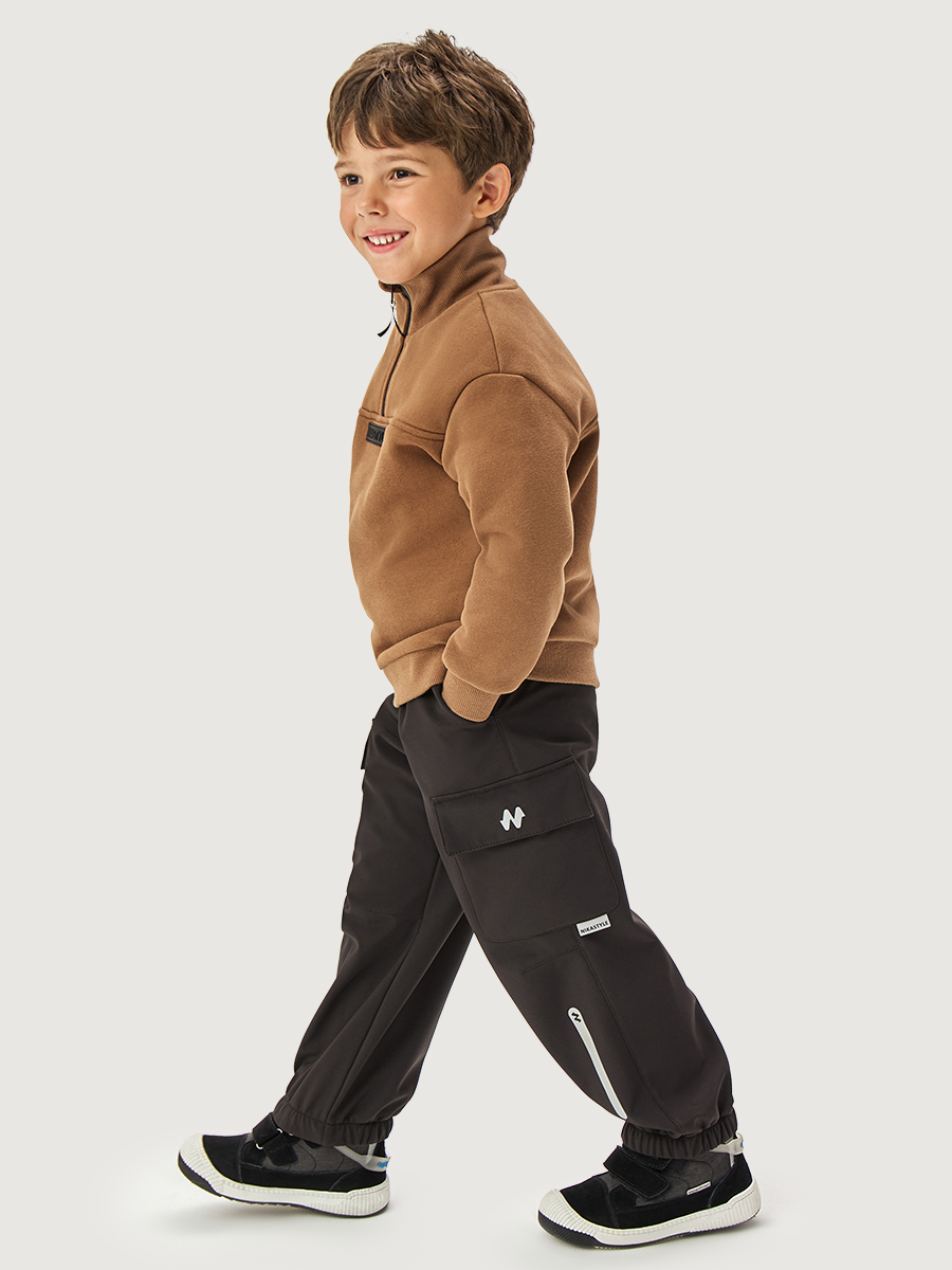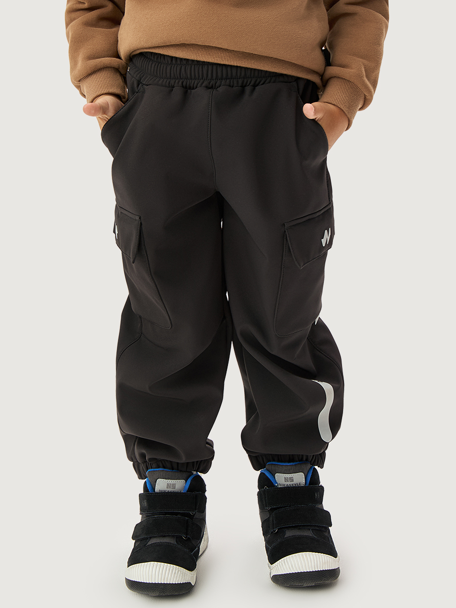 Брюки КАРГО из Softshell идеально подходят активным детям на прогулках, которые много двигаются и не сидят на месте. Softshell - это инновационный материал нового поколения, внешний слой которого защищает от влаги и ветра, внутренний слой из флиса сохраняет тепло и отводит лишнюю влагу, а промежуточный мембранный слой имеет хорошую паропроницаемость и позволяет коже дышать. Softshell приятный на ощупь, легкий и эластичный материал, не сковывающий движения ребенка.
