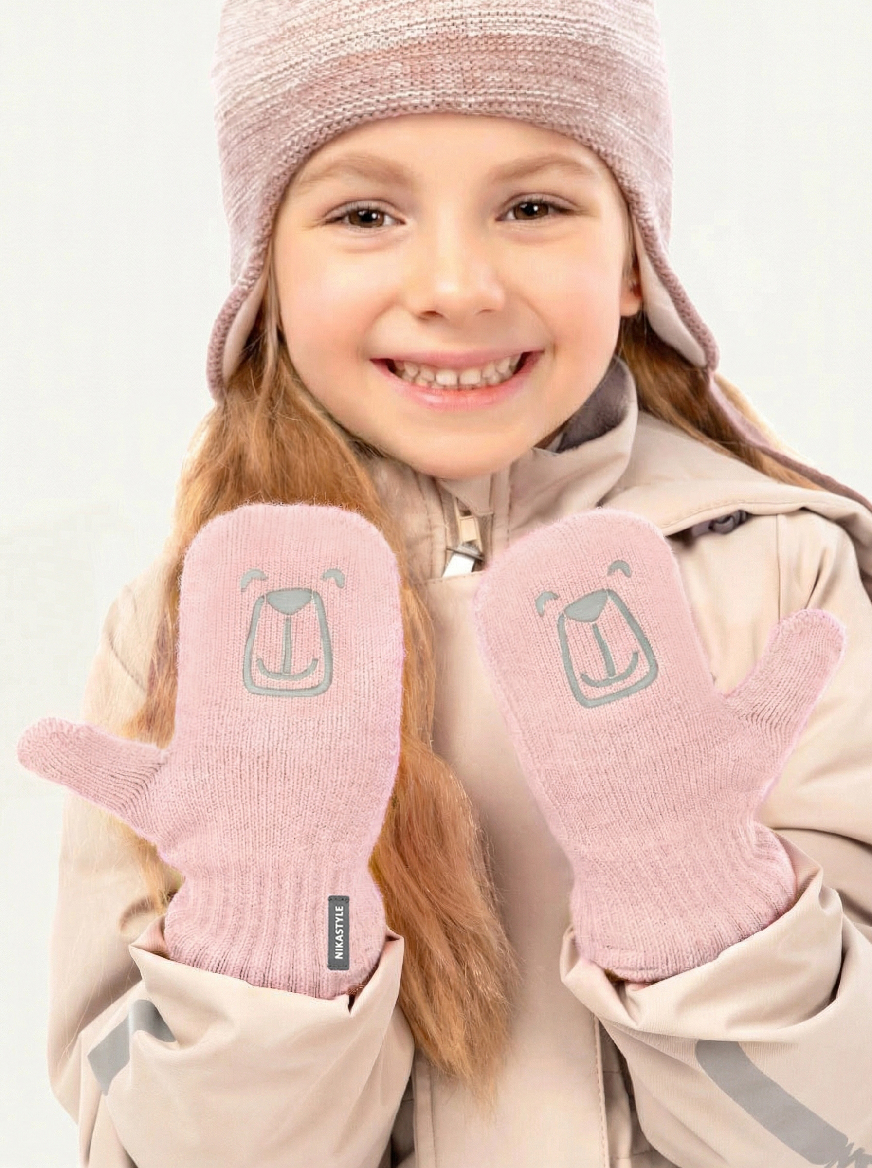 Однослойные детские варежки БАЛУ из вискозной пряжи, со светоотражающим принтом. Варежки на тесьме -антипотеряшке. Комфортная температура эксплуатации от -5°С до +10°С Варежки отлично сочетаются с другими изделиями NIKASTYLE.