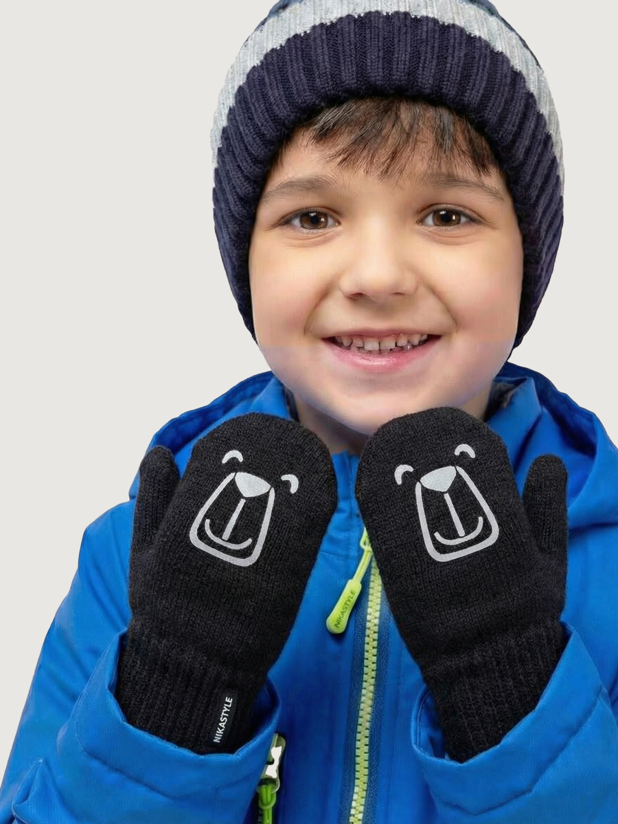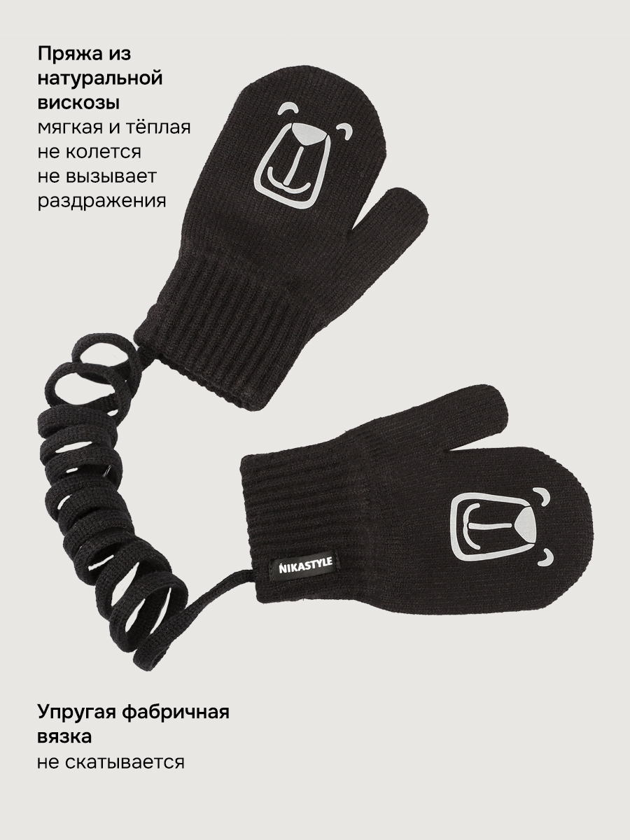 Однослойные детские варежки БАЛУ из вискозной пряжи, со светоотражающим принтом. Варежки на тесьме -антипотеряшке. Комфортная температура эксплуатации от -5°С до +10°С Варежки отлично сочетаются с другими изделиями NIKASTYLE.