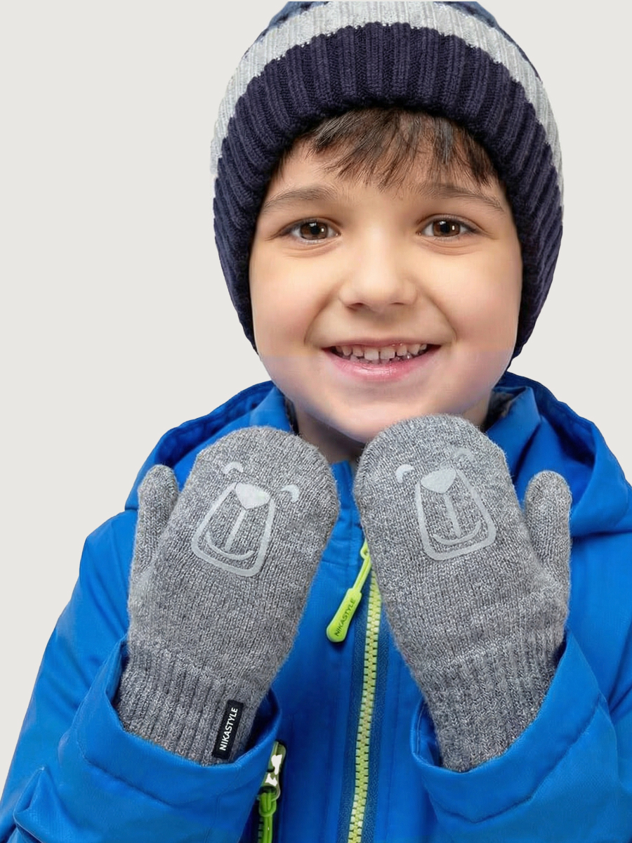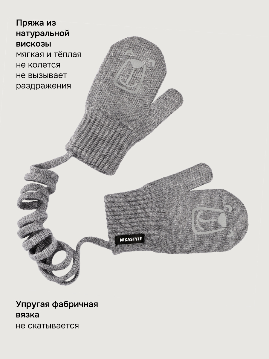 Однослойные детские варежки БАЛУ из вискозной пряжи, со светоотражающим принтом. Варежки на тесьме -антипотеряшке. Комфортная температура эксплуатации от -5°С до +10°С Варежки отлично сочетаются с другими изделиями NIKASTYLE.