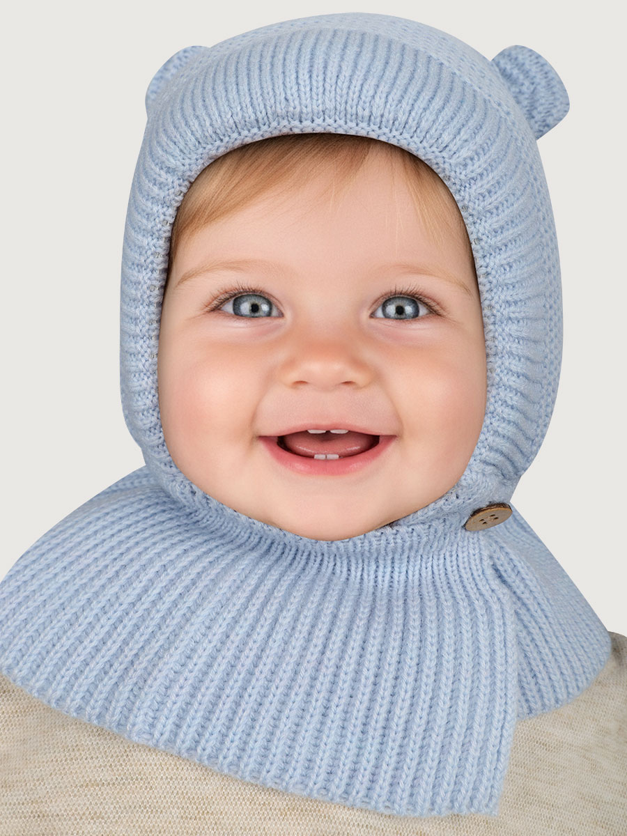 Зимняя полушерстяная балаклава шлем УМКА. Балаклава обладает удобной эргономичной формой, которая надежно и плотно облегает голову крохи, прикрывая ушки, а мягкая резинка вокруг лица не натирает и не жмет. Особенностью представленной модели является манишка, заменяющая шарф, которая регулируется по шее ребенка и застегивается на маленькую пуговку.
